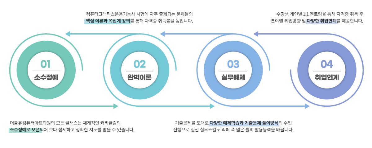 소수정예로 진행되는 더블유컴퓨터아트학원의 수업을 통해 수강생은 구체적이고 섬세한 지도를 받을 수 있습니다. 강사 또한 개개인을 위한 수업지도에 집중할 수 있도록 커리큘럼이 구성되어 있어 더블유컴퓨터아트학원은 매 회 90% 이상의 자격증 취득률을 유지하고 있습니다.